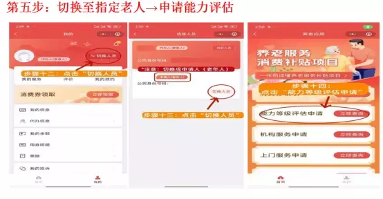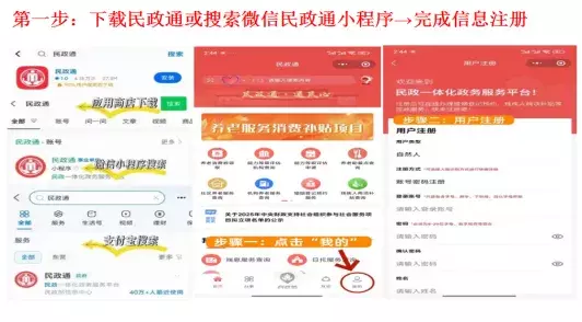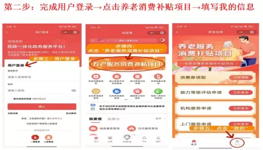 中度以上失能老年人或其代办人(含老年人配偶、子女、其他亲属以及村、 社区工作人员,养老服务机构工作人员等)按照自愿原则,通过“民政通”线上注册个人账号,并提交领取养老服务消费补贴的申请。