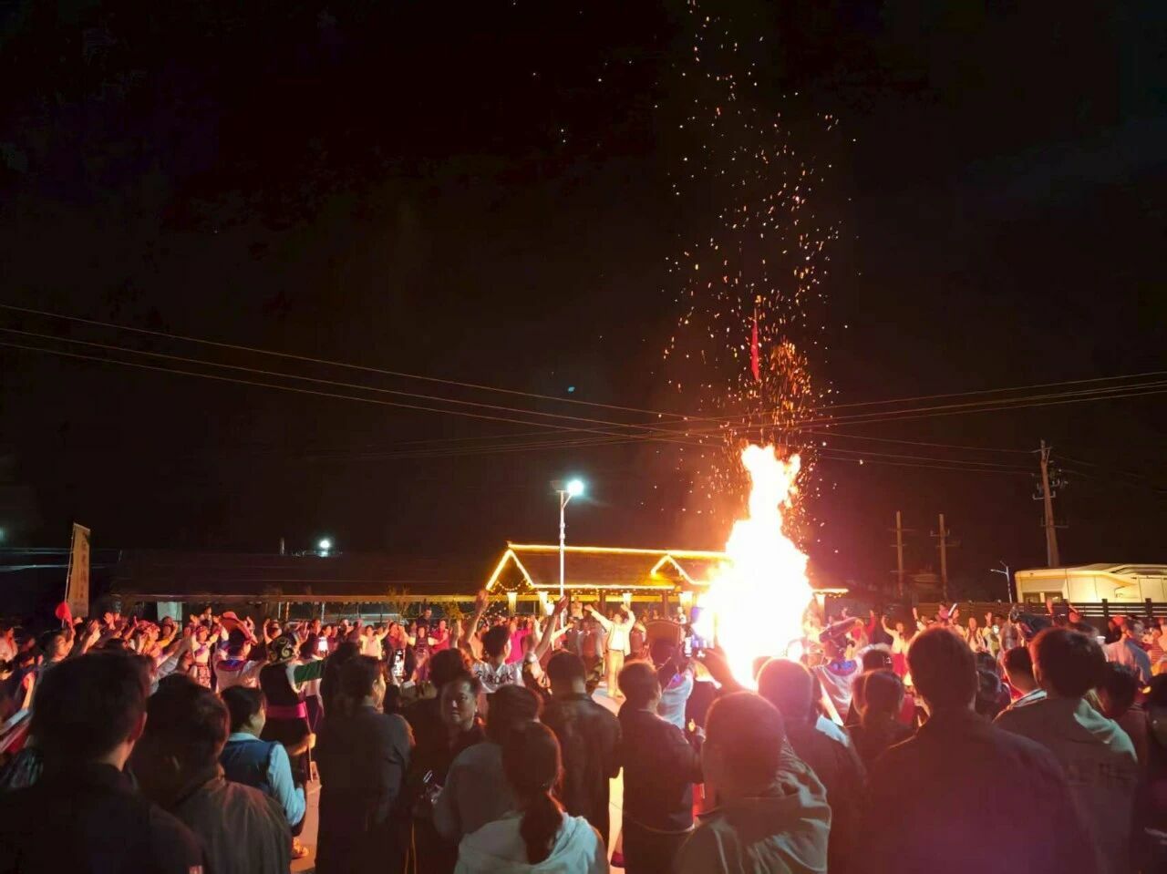 而当夜幕降临,演出接近尾声,备受期待的锅庄篝火互动环节正式开启。欢快的音乐响起,现场观众纷纷手拉手,围绕着篝火跳起了锅庄舞。一时间,歌声、笑声、欢呼声交织在一起,整个现场变成了一片欢乐的海洋。