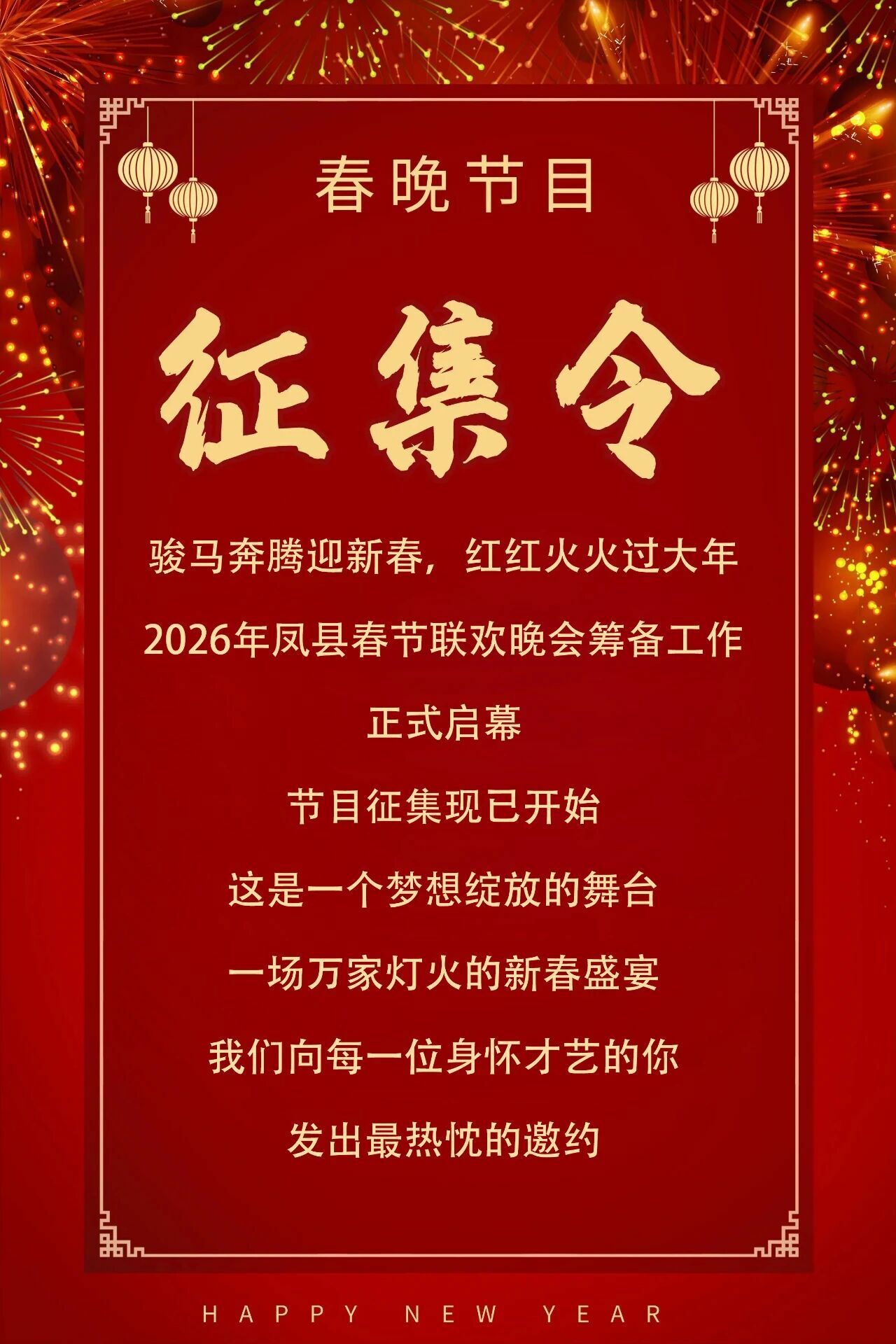 为深入贯彻落实习近平文化思想,紧扣党的二十大及二十届历次全会精神,践行文化“两创”要求,展现凤县人民奋发进取的精神风貌,营造欢乐祥和的节日氛围,现面向全县征集2026年春节联欢晚会节目。