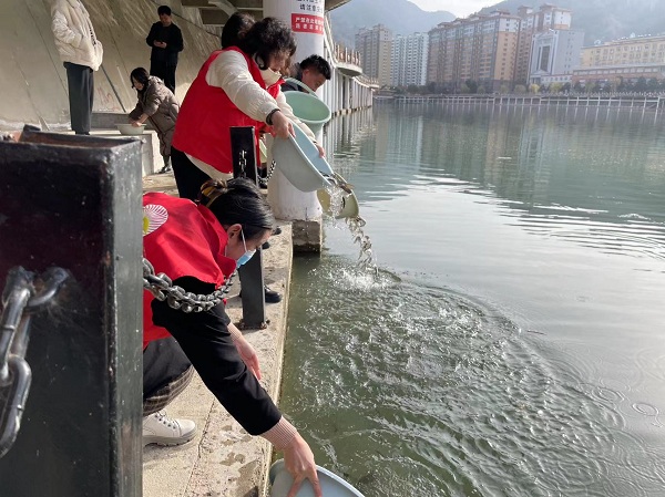 活动现场,志愿者们将一盆盆鱼苗倒入江水中,一条条小鱼跃入河中,激起朵朵浪花,为嘉陵江凤县县城段水域注入“新鲜血液”,强化改善水域质量和提高生态环境稳定性。此次“增殖放流”活动共计放流鱼苗约16万尾,这些鱼苗进入水中将化身水域“清道夫”,以期达到“以鱼净水”的生态环保目的。此外,社区也积极倡导广大辖区居民群众积极近参与县城水域生态保护,不在水边钓鱼,带动辖区内更多的人关心保护水域生态环境。
