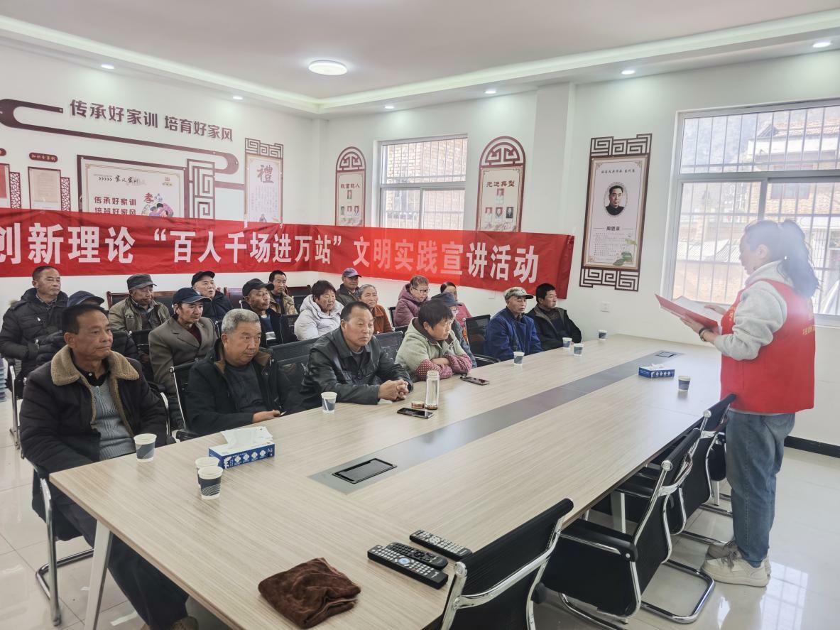 春潮涌动启新程,理论宣讲润民心。2月10日下午,凤州镇党的创新理论“百人千场进万站”文明实践宣讲活动在龙口村一楼会议室温情开讲。恰逢龙口村社火队加紧排练新春民俗节目,吸引了不少村民观看,“红小凤”宣讲队队员抓住群众聚集契机,面向前来观看社火的群众开展宣讲,40余名群众认真聆听,让党的创新理论与实用安全知识走进群众心中。