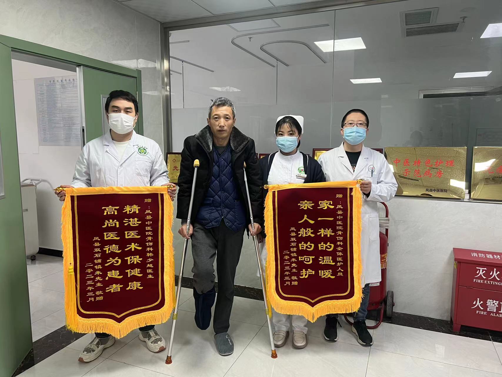 近日,患者朱某和家人手捧三面锦旗送到凤县中医医院骨伤科,再三感谢全体医护人员对他的精心治疗和热心服务。