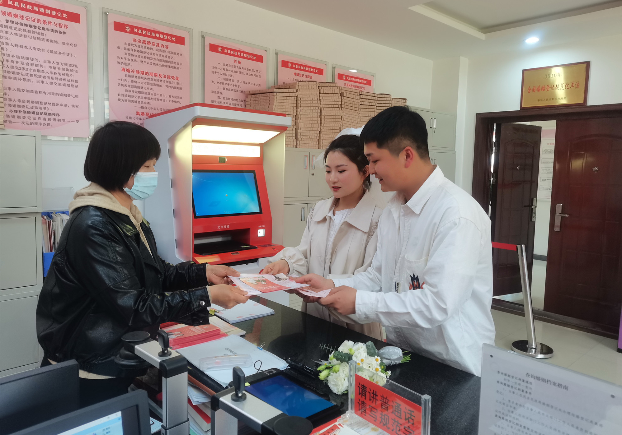二是加强业务培训提升服务水平。用好婚姻登记智能服务终端一体机、多功能服务一体机等设施,为群众提供智能化服务;婚姻登记人员通过不定时线上+线下业务培训提高自身业务水平,在“情人节、520、七夕”等特殊日期向已经办理结婚登记的新人发放婚事简办倡议书共计700余份,鼓励新时代的年轻人,顺应时代潮流,树立新型婚育观念;针对典型业务案例,及时疏导当事人情绪、适当安抚,耐心准确解释法律条文并给予适当建议,化解矛盾纠纷,促进家庭稳定。