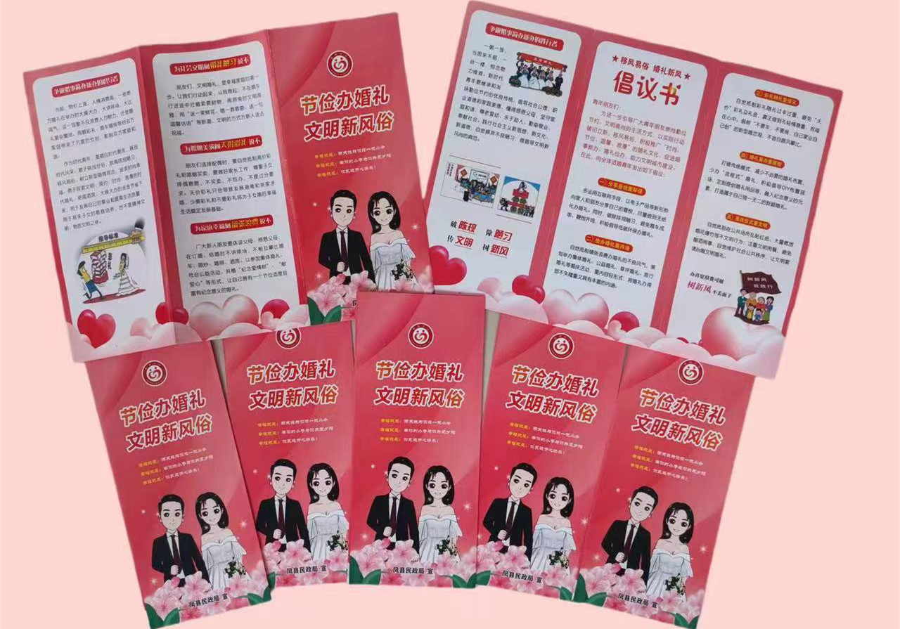 三是强化宣传教育抵制婚嫁陋俗。利用普法宣传日、科技之春、新时代文明实践志愿活动宣传日等,在县城中心广场、体育场等人流量大的场所宣传“节俭办婚礼 文明新风俗”,利用镇村宣传栏等宣传阵地张贴“倡导文明婚俗 弘扬时代新风”倡议书;指导全县66个村成立红白理事会,引导群众婚事新办、婚事简办,大力遏制高价彩礼、人情攀比、铺张浪费等陈规陋习,切实减轻人民群众在婚事习俗中的人情、宴席、彩礼等支出负担;利用凤县民政公众号发布婚事简办线上推文,向群众传达树立良好的家风,传承优秀传统文化,积极培育践行社会主义核心价值观,大力推进婚姻领域移风易俗,抵制婚俗陋习从每个家庭自身做起,以文明家风为新婚的年轻人树立好的榜样。