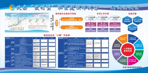 坚持党的建设不动摇、指标落实不松劲的工作理念,紧盯县域便利型社区建设实情,根据每个社区建设差异化,制作凤县便利型社区建设分区作战图,以“挂图作战”促达标的目的,建立“四大战区”(即:新民街战区、新建路战区、杨家坪战区、龙口战区),实施挂图作战、责任到人、措施到区,引领社区在完成“规定动作”的同时创新“自选动作”。新民街战区通过“小红星”链接“小网格”;“小哨子”办好亲民事;“小活动”搭起“微平台”;“小家庭”凝聚“大合力”;“小服务”办好“身边事”,把党群服务延伸至每个居民群众。2023年年初被命名为全市首批“四型”社区。新建路战区通过梳理涉及民政、社保、医保、公安户籍、退役军人事务等与群众生产生活密切的事项61项,社区便民服务站“一站式”受理办结率达到100%,网办率达80%以上;制作“便民服务导览图”,更好地为居民出行提供可视性便利服务。2022年底通过市专项组验收。杨家坪战区通过开展“四心”服务、“三单”服务、“定制”服务,着力解决群众急难愁盼问题。对标市考指标自查,已达到便利型社区标准。龙口战区将辖区划分成7个网格,选聘7名网格员,形成由网格服务员、楼栋长、微信平台、为民连心卡、百姓说事点组成的“五位一体”的服务模式。该社区有望年底达到便利型社区标准。