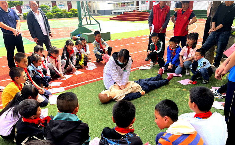 活动现场,留凤关镇中心卫生院医师向学校师生详细介绍了心肺复苏的概念进行了。医生告诉同学们,如果在4分钟中内进行心肺复苏,约有一半的人都能被救活。只有人人都掌握救人的技能,遇到此类病人都会有获救的机会。随后,医生重点讲解了心肺复苏的操作技能及步骤,包括确认现场安全、判断患者意识、呼救进行复苏等几个步骤,并且进行现场示范,指导学生进行实际操作。