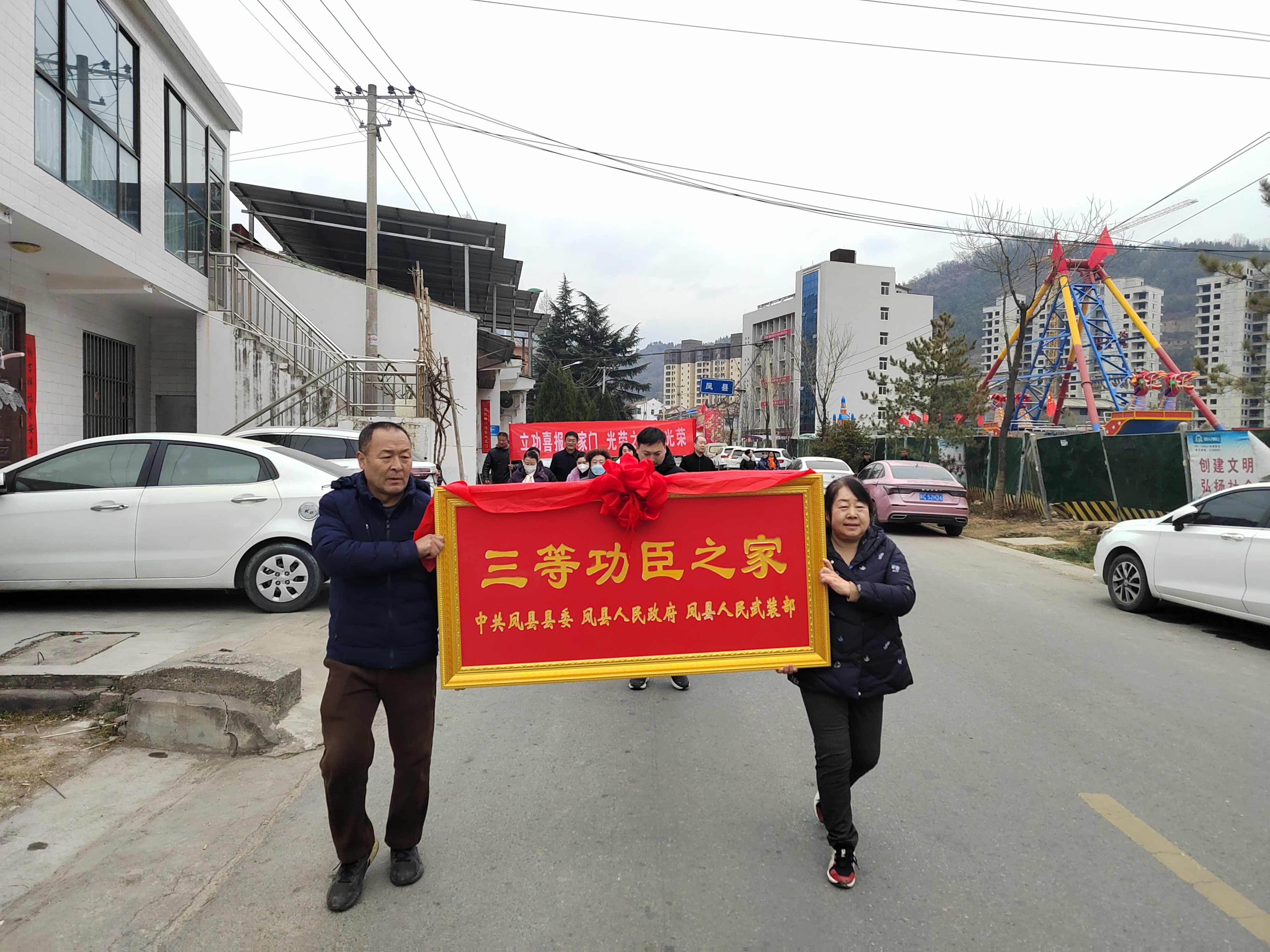 一人立功,全家光荣。近日,凤县退役军人事务局、县人民武装部,在镇村主要领导干部陪同下前往酒铺村、桥头庄村、杨家坪社区,分别向何鑫、王文涛、曾航三名荣立三等功的现役军人家中送去立功喜报、功臣牌匾和慰问金,让军属共享喜悦荣光。