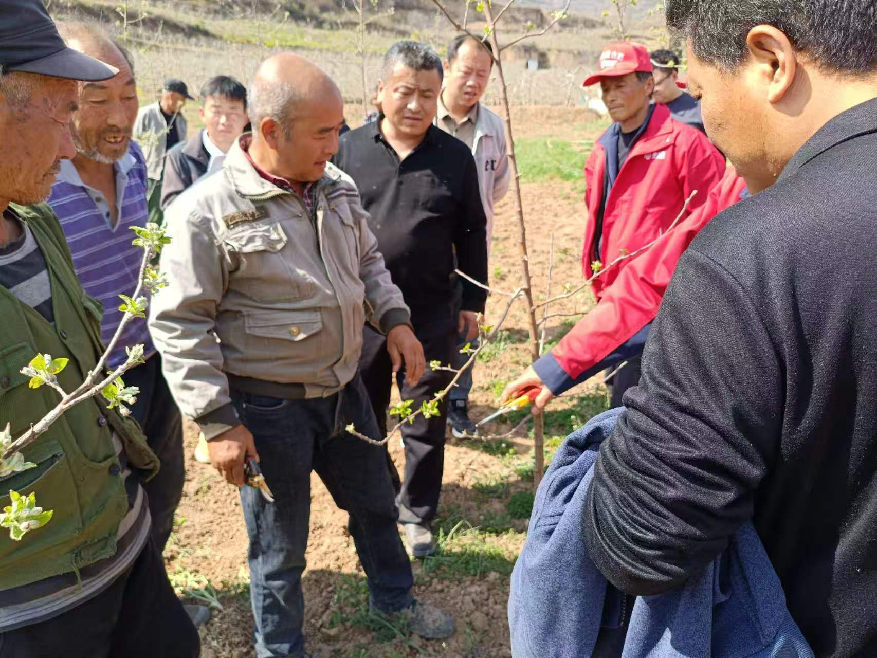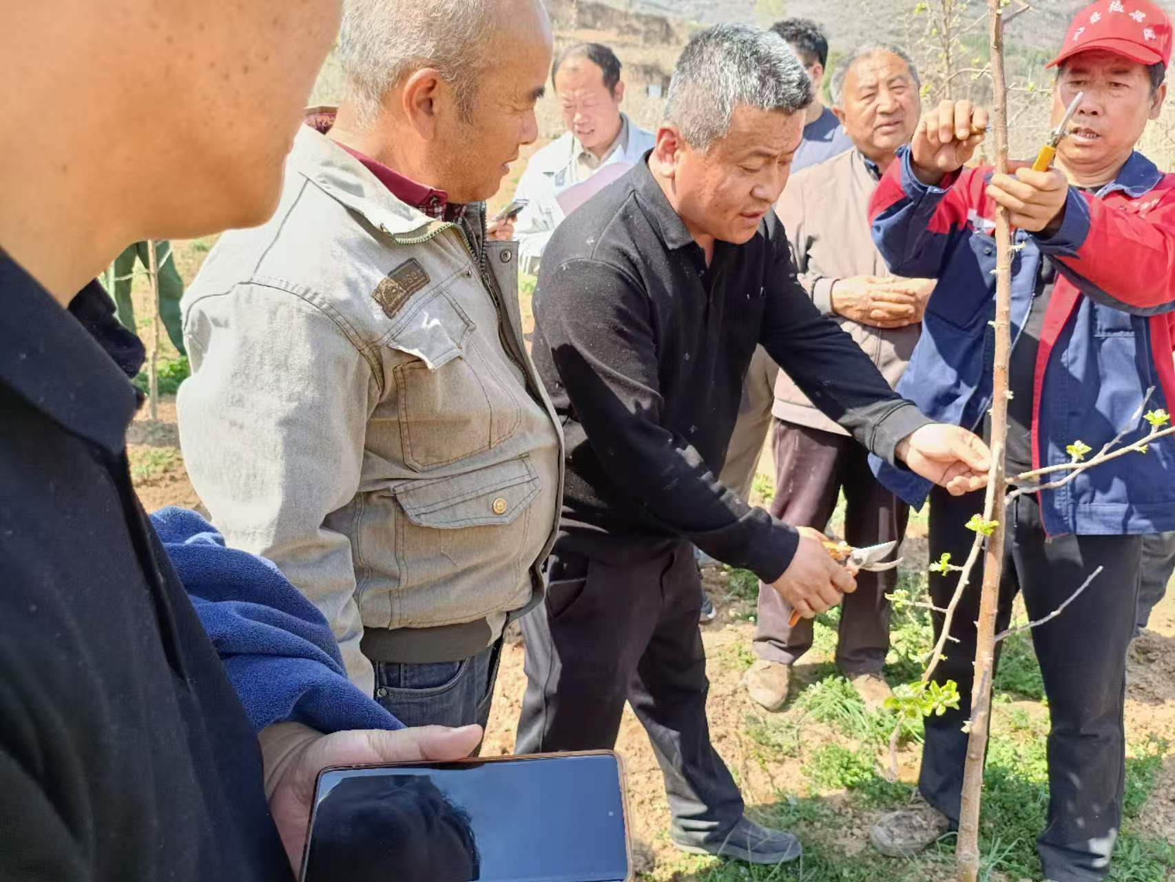 培训现场,围绕春季苹果园核心管护要点,采用理论讲解+现场实操+一对一答疑相结合的方式,逐一进行细致讲解与示范。重点围绕秦脆幼园光秃带不宜出枝等问题,从刻芽操作、水溶肥冲施、拉枝整形等技术展开细致教学,从刻芽的时机把控、部位选择、力度掌握,到刻芽后发枝素的规范涂抹方法,合理冲施水溶肥,再到拉枝的角度调整、树形修整技巧,均进行全程实操演示,细致讲解每一个操作细节。此外,围绕春季果园水肥管理、病虫害绿色防控、疏花疏果等春季综合管护知识,也进行了全面讲解,耐心解答果农在日常种植中遇到的各类疑难问题,将实用技术精准送到果农手中。