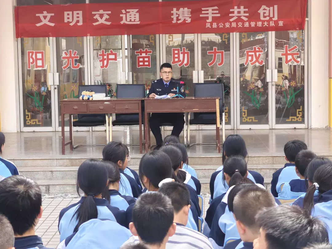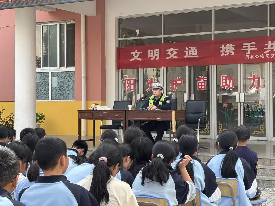 随后,凤县公安局交通警察大队宣讲民警聚焦校园周边道路出行安全,结合辖区交通事故案例,用图文并茂、互动问答的形式,为学生普及道路交通安全知识。重点讲解步行、骑行、乘车等日常出行的安全规范,强调过马路走人行横道、不翻越护栏、不闯红灯、不乘坐非法营运车辆、杜绝骑行电动自行车载人等注意事项,细致宣讲交通标志、交通信号灯的识别方法,以及突发交通状况的应急处置技巧。宣讲过程中,民警与学生频频互动,耐心解答学生提出的交通安全疑问,进一步加深学生对交通安全知识的记忆,让学生时刻绷紧交通安全这根弦。