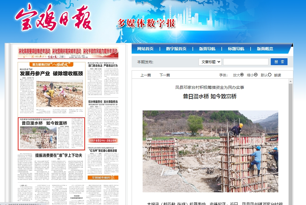 机器轰鸣、夯锤起落。近日,凤县凤州镇邓家台村钢板桥项目施工现场一派繁忙景象。该项目预计5月中旬建成投用,建成后不仅能方便群众出行,还将助力该村发展花椒、苹果等产业,帮助群众增收致富。