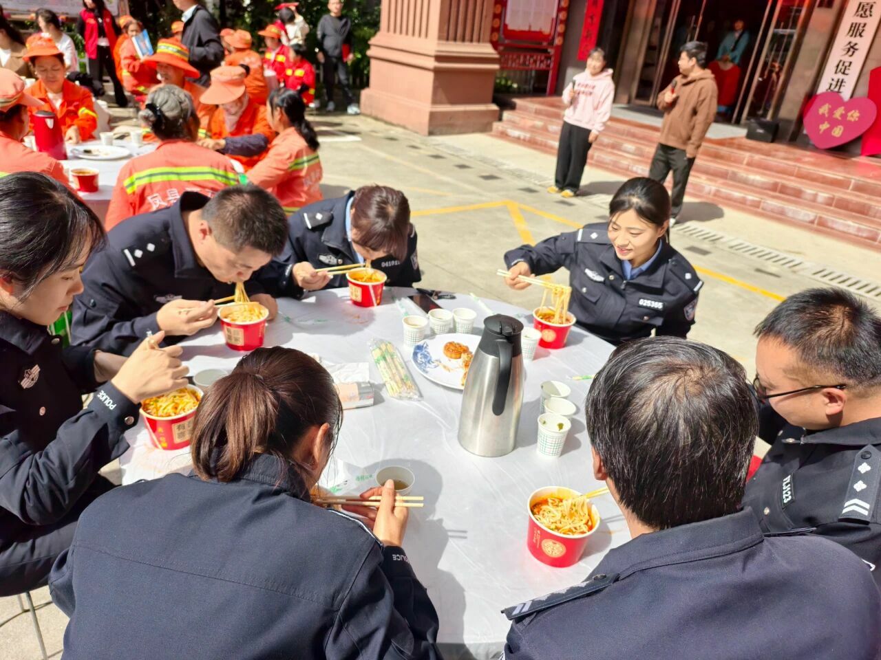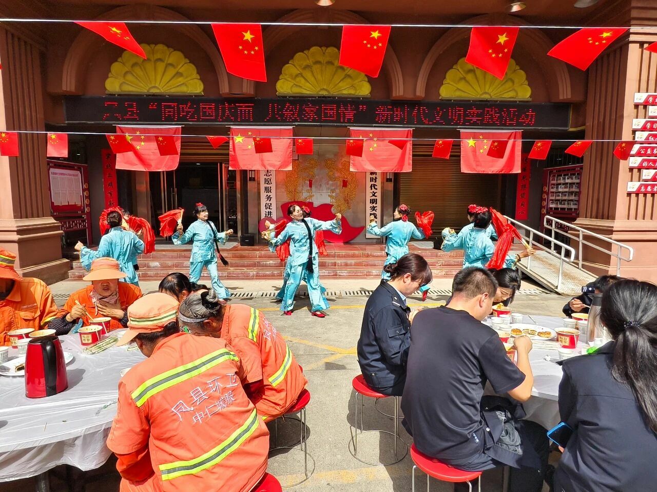 国庆吃面,国泰民安。9月29日上午,凤县县委宣传部、县总工会、县市监局在祖国76周年华诞来临之际,精心组织开展“同吃国庆面 共叙家国情”文明实践活动,环卫工人、交通警察、道德模范和社区居民代表齐聚一堂,以温情满满的仪式感,凝聚爱国情怀,共贺祖国华诞。