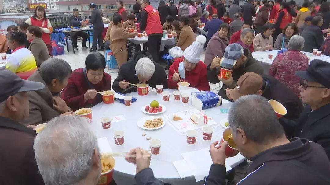 邻里才艺秀环节,杨家坪、新建路、新民街、龙口等社区居民带来手工花束、干花团扇、刺绣包、雕刻作品等手工艺品展示,展架上的毛笔字“福”、剪纸、麦秆画等也尽显邻里巧思与生活热情。互动游戏环节热闹非凡,现场欢声笑语不断。活动最后,大家一同分享寓意健康长寿的长寿面,在团圆氛围中为活动画上圆满句号。