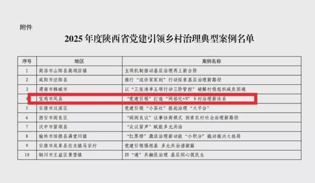 近日,中共陕西省委社会工作部、陕西省农业农村厅印发《关于推介2025年度陕西省党建引领乡村治理典型案例的通知》,《凤县“党建引领”打造“网格化+N”乡村治理新体系》入选,成为宝鸡地区唯一入选典型案例。