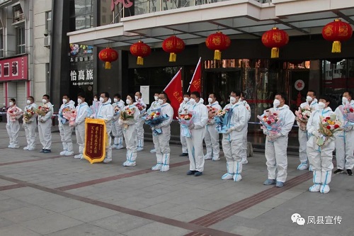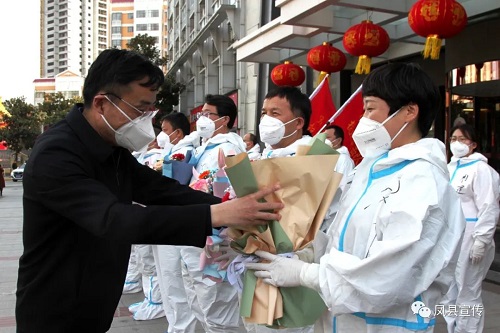 县委书记张扬代表县委、县政府向圆满完成支援任务的全体队员表示崇高的敬意和最热烈的欢迎,并向一直默默牵挂和支持突击队队员的家属们致以诚挚的问候和衷心的感谢。他表示,在宝鸡疫情形势最严峻的时刻,突击队队员们积极响应号召,坚决服从县委、县政府安排,不畏艰险、不怕困难、逆行出征,义无反顾奔赴抗疫第一线,圆满完成了支援任务,彰显了凤县力量,展示了凤县精彩,激发了奋斗精神。他叮嘱返凤的突击队队员们安心休养,以更加健康的体魄、更加饱满的精神面貌、更加昂扬的奋斗姿态投入新的工作,将抗疫精神转化为凤县今后绿色振兴、高质量发展新的动力,为凤县作出更大的贡献,奋力夺取凤县疫情防控和经济社会发展双胜利。