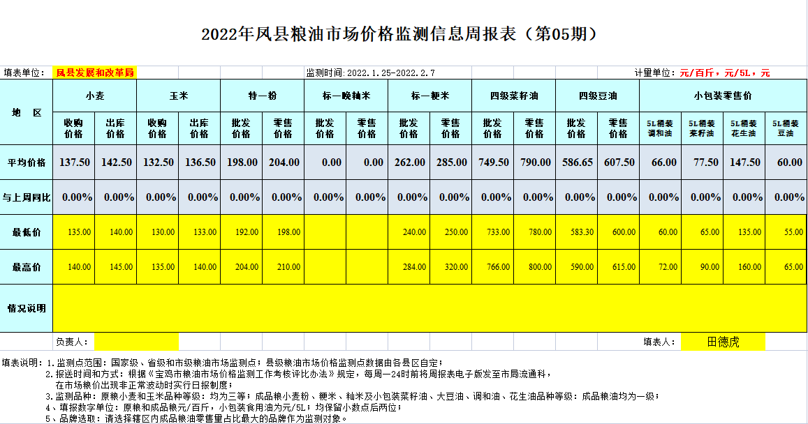 2022年凤县粮油市场价格监测信息周报表(第05期)