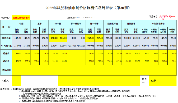2022年凤县粮油市场价格监测信息周报表(第30期)