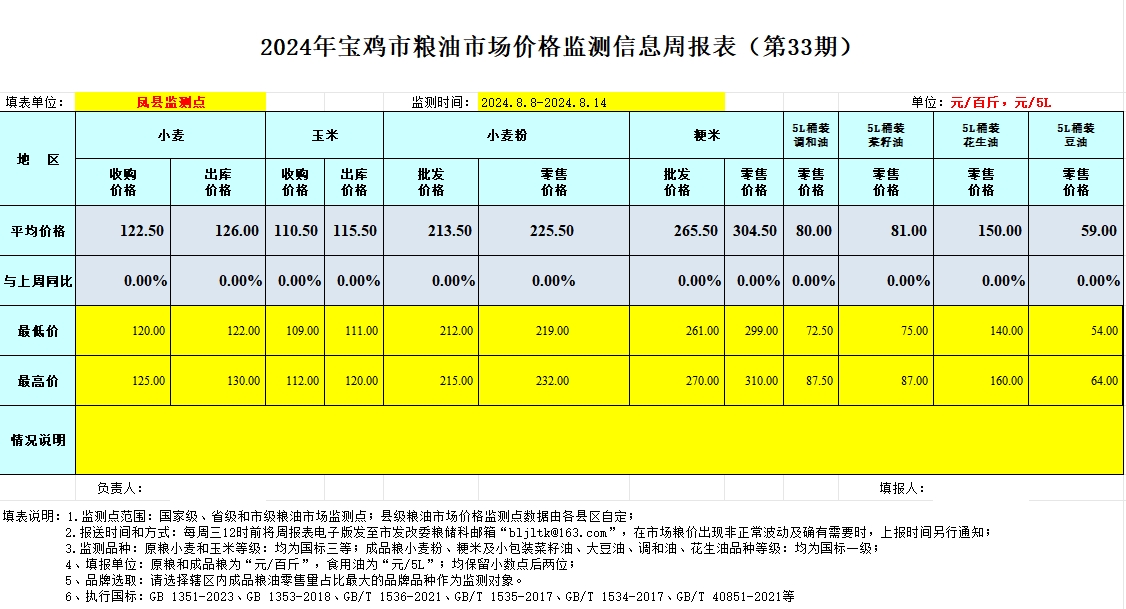 2024年宝鸡市粮油市场价格监测信息周报表(第33期)