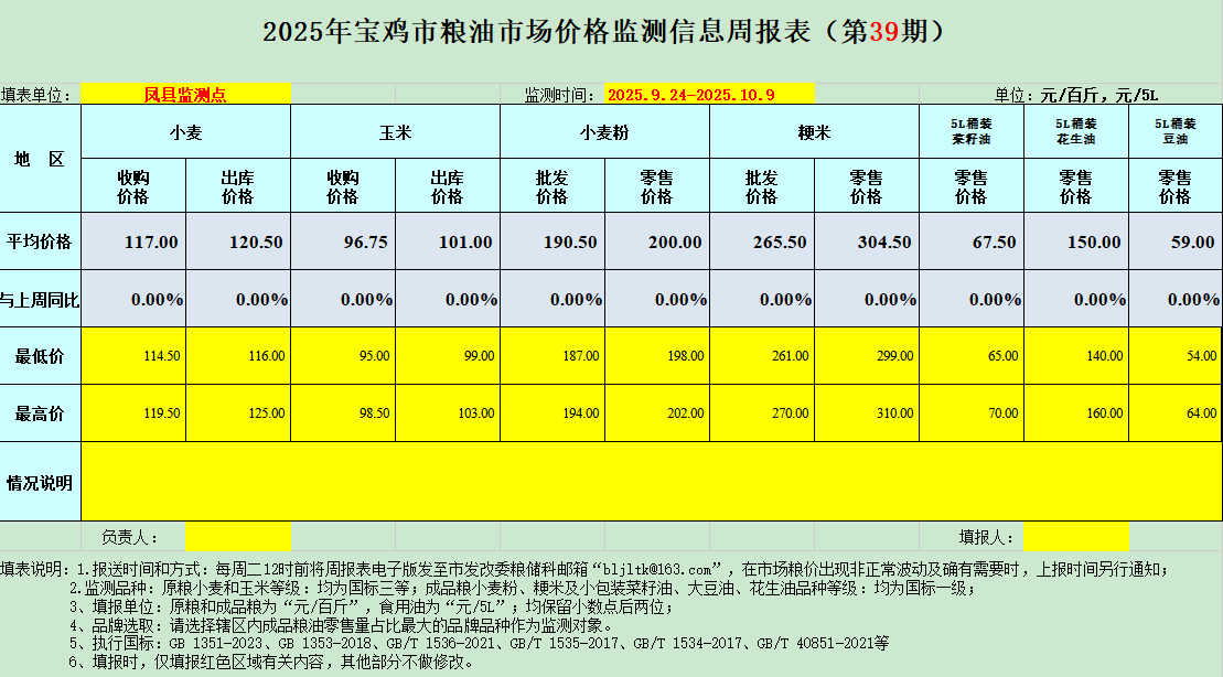 2025年宝鸡市粮油市场价格监测信息周报表(第39期)