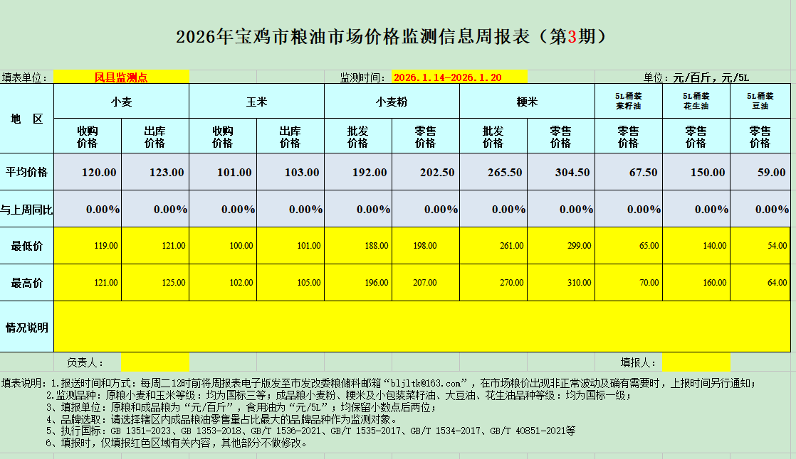 2026年宝鸡市粮油市场价格监测信息周报表(第3期)