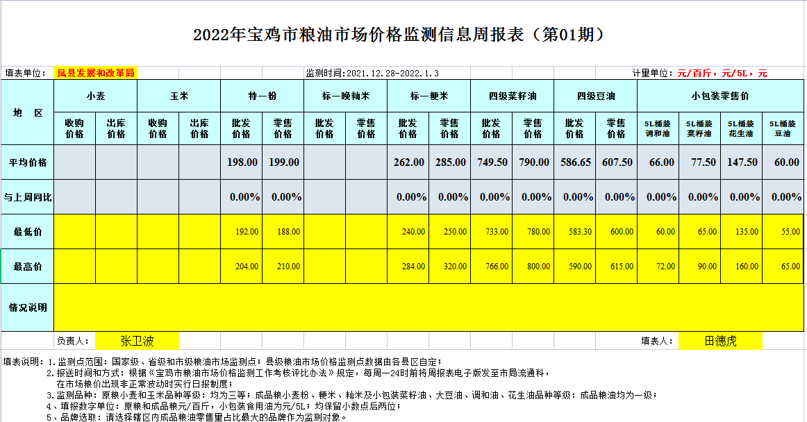 2022年宝鸡市粮油市场价格监测信息周报表(第01期)