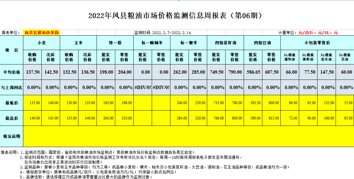 2022年凤县粮油市场价格监测信息周报表(第06期)