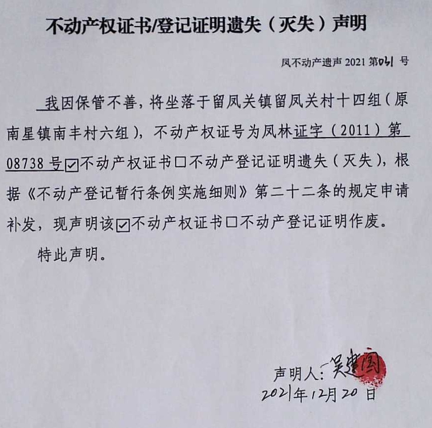 根据《不动产登记暂行条例》等相关规定,现将王勇军、吴建国的不动产权证书(原林权证)遗失声明予以公告,若对公告的不动产权有异议者,请于公告之日起15个工作日内向凤县不动产登记局书面提出申请复查。逾期没有提出异议的,即认为上述公告有效,原林权证作废。