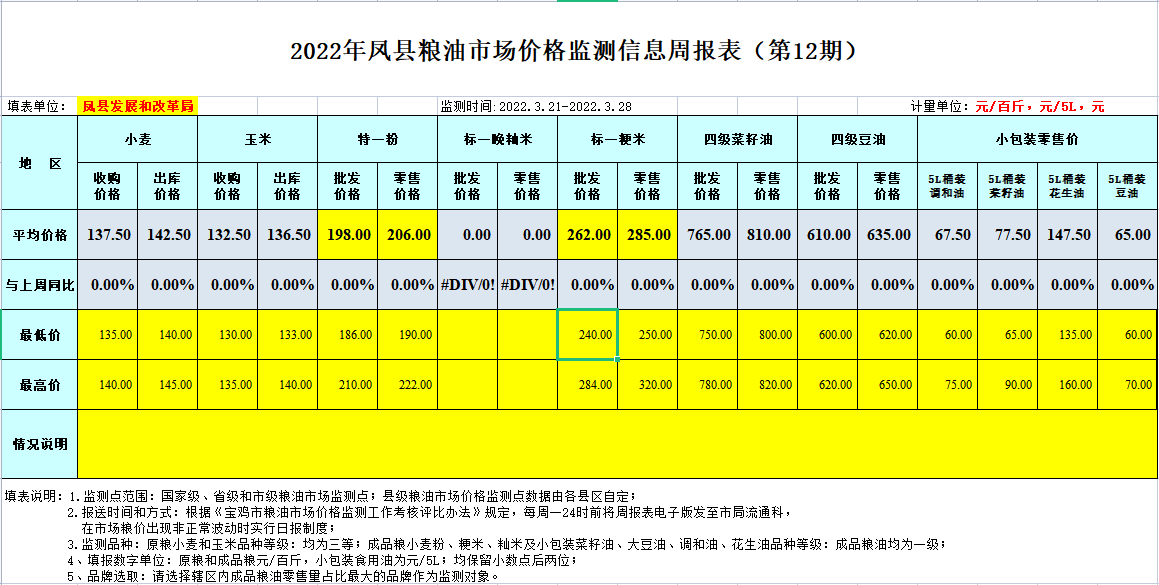 2022年凤县粮油市场价格监测信息周报表(第12期)
