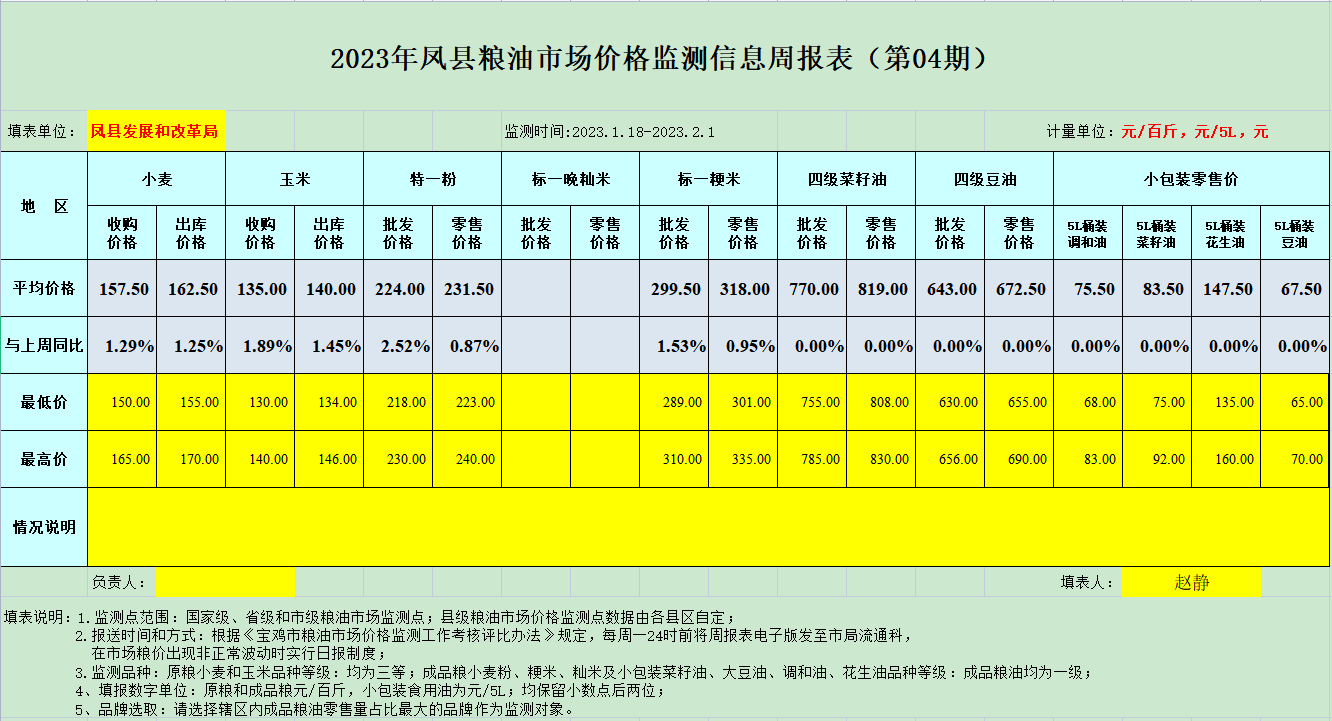 2023年凤县粮油市场价格监测信息周报表(第04期)