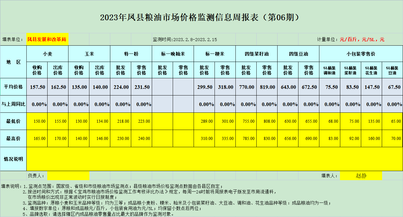 2023年凤县粮油市场价格监测信息周报表(第06期)