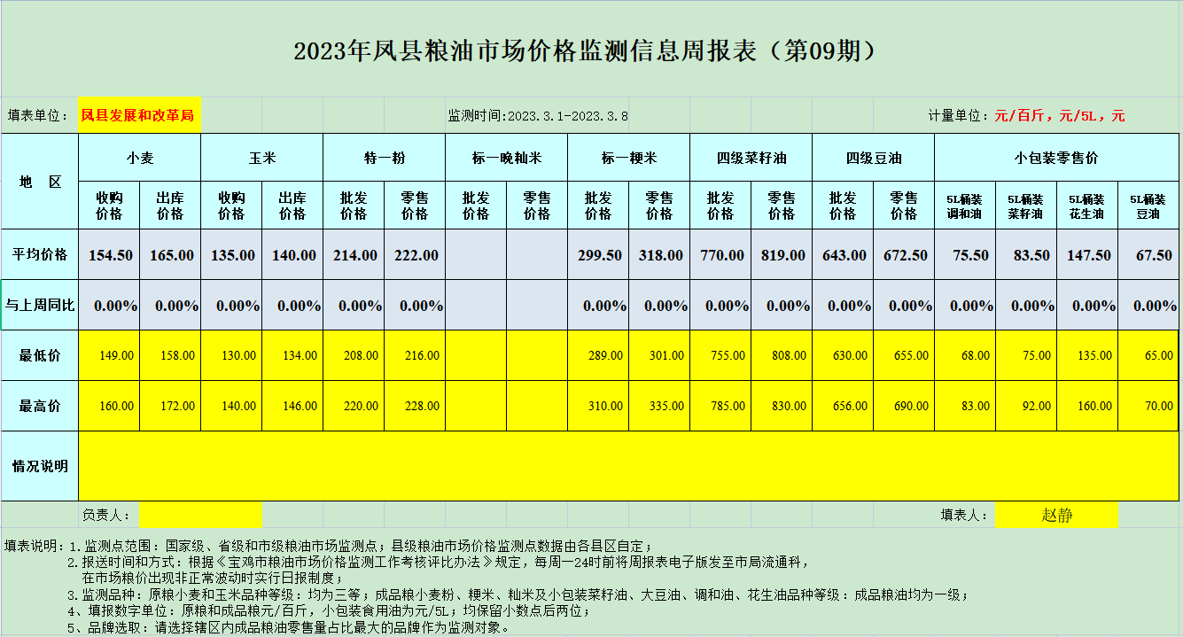 2023年凤县粮油市场价格监测信息周报表(第09期)
