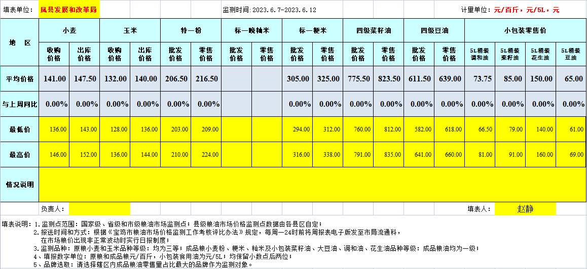 2023年凤县粮油市场价格监测信息周报表(第24期)