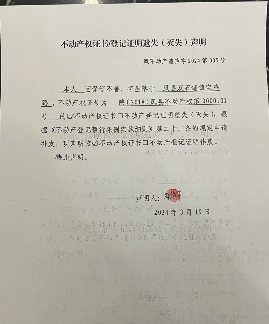 根据《不动产登记暂行条例》等相关规定,现将蔡情华不动产权证书,证号为(陕(2018)凤县不动产权第0000101号)遗失声明予以公告,若对公告的不动产权有异议者,请于公告之日起15个工作日内向凤县不动产登记局书面提出申请复查。逾期没有提出异议的,即认为上述公告有效,原不动产权证书作废。