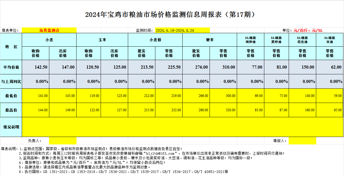 2024年宝鸡市粮油市场价格监测信息周报表(第17期)