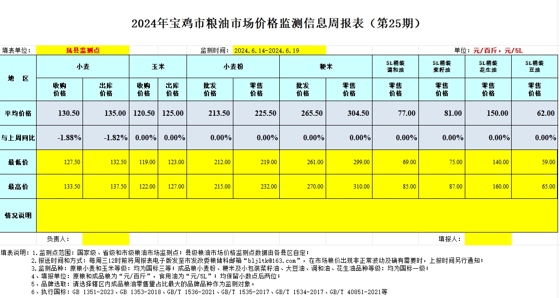 2024年宝鸡市粮油市场价格监测信息周报表(第25期)