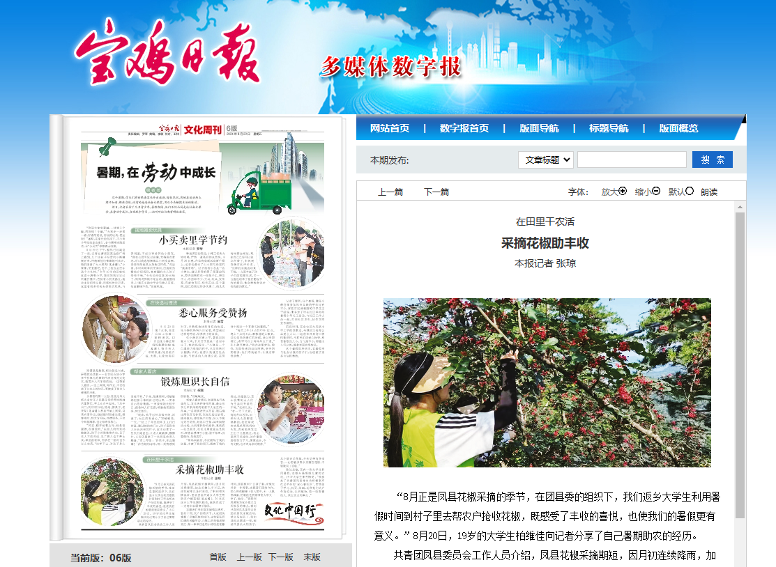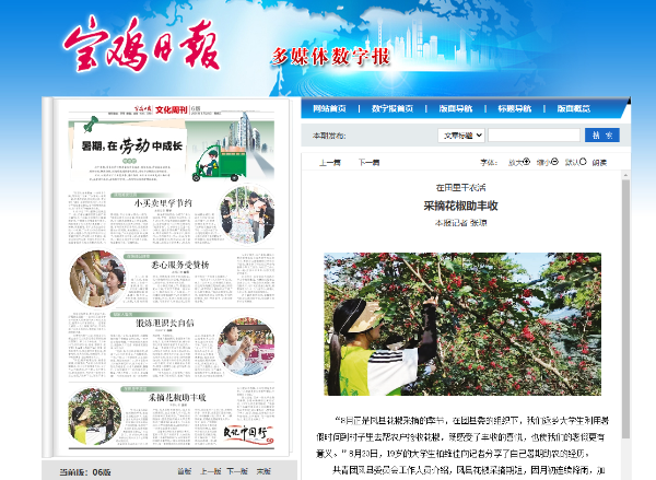 “8月正是凤县花椒采摘的季节,在团县委的组织下,我们返乡大学生利用暑假时间到村子里去帮农户抢收花椒,既感受了丰收的喜悦,也使我们的暑假更有意义。”8月20日,19岁的大学生柏维佳向记者分享了自己暑期助农的经历。